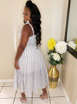 Pretty is as pretty does in our Allie Dress. Featuring semi stretch fabric, square open neckline, feminine stripe detailing, tie up shoulder straps, lining and beautiful layering. this midi dress is a Spring/Summer must have.