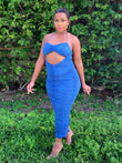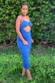 No feeling blue in our Ashanti Midi Dress. Featuring stretch fabric, round neckline, tie around the neck straps, cut outs, roughing, bold blue coloring back slit and zipper closure.