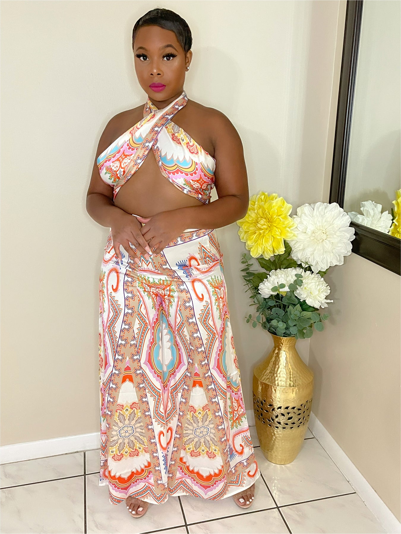 Nothing but tropical vibes in our Anguilla Set! Featuring a semi stretch fabric, wrap around crop top, matching high waist palazzo pants with vibrant coloring, bold pattern and tie up closure. This Pants Set is a must.
