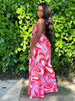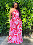 Turn every sidewalk into a runway with the Cherry Swirl Jumpsuit. Designed with a striking swirl print in cherry-red tones, this one-piece was made for women who thrive on bold, urban-chic style.