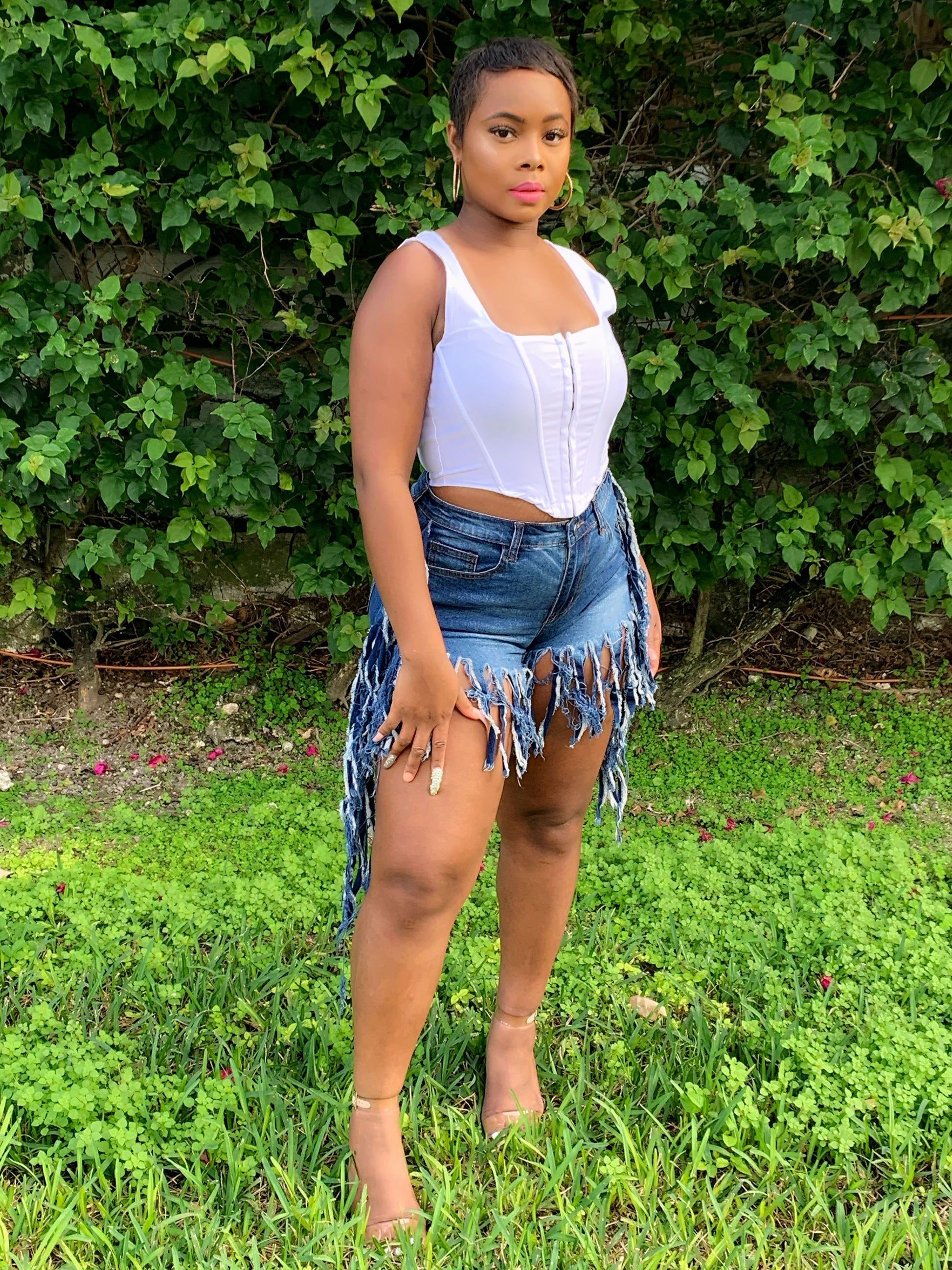 Dress up any bottom in our Dior Top White. Featuring a stretch fabric, round neckline, bustier style, with bold coloring and hook closures