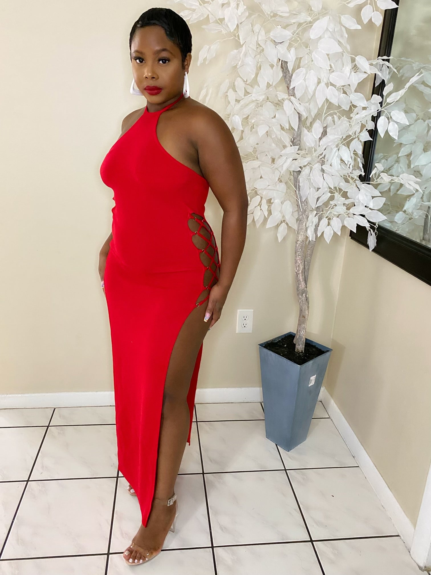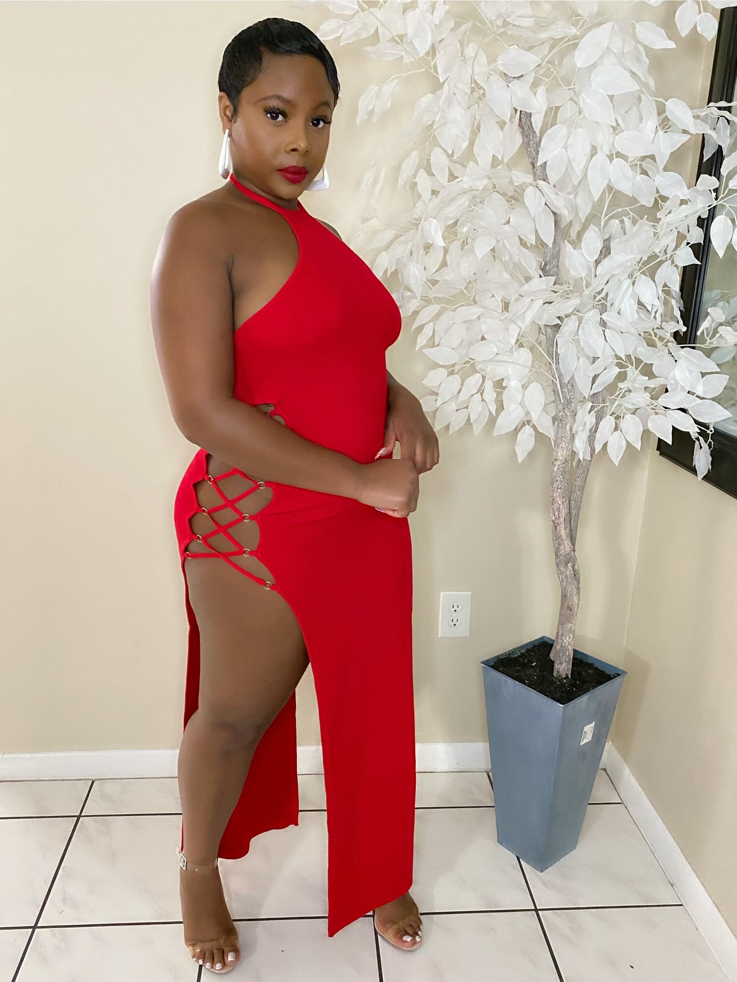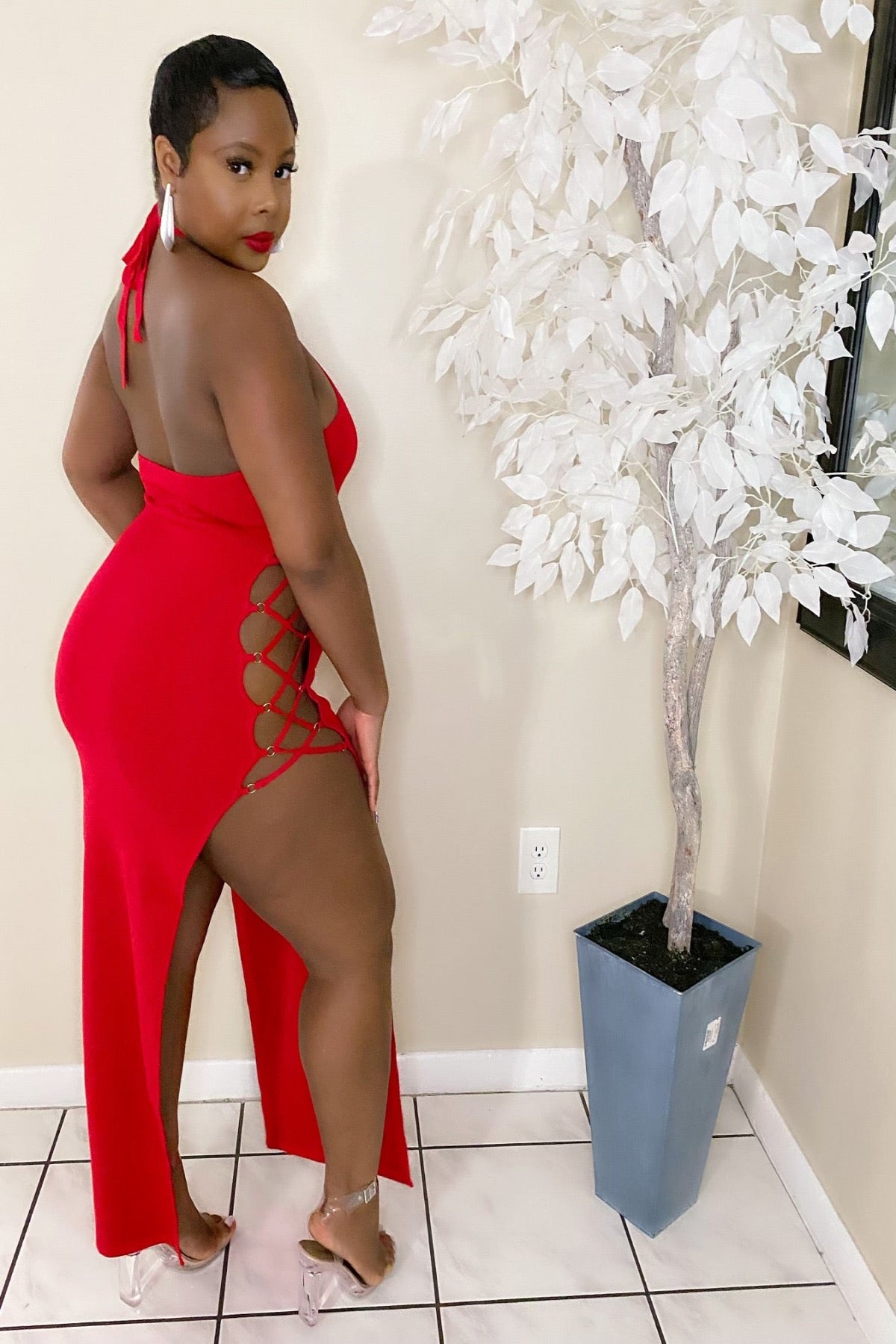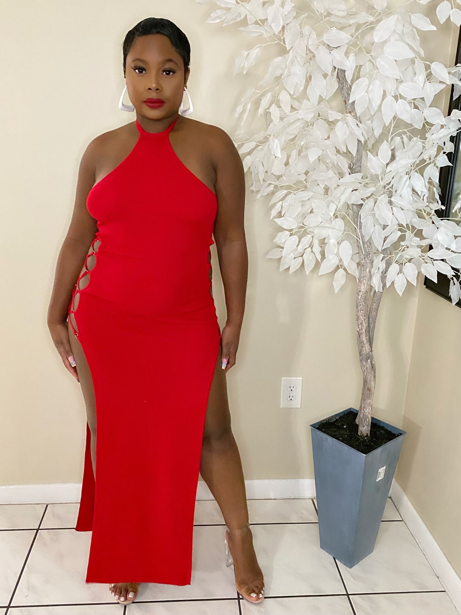 If fierce was a dress, it would be our Sasha Maxi Dress! Our Spicy Dress features a halter neckline, sexy cut outs, thigh high slits, and amazing stretch! Pair this look up with your sexiest high heels and bold accessories and you are IT!