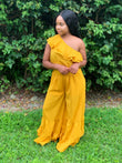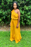 Looking for that one vibrant jumpsuit sure to keep you chic all Summer long then our Apricot jumpsuit is for you. It's featuring semi stretch material, one shoulder ruffle styling complete with a waist tie and underlining wide leg bottoms. Available in sizes S, M, L