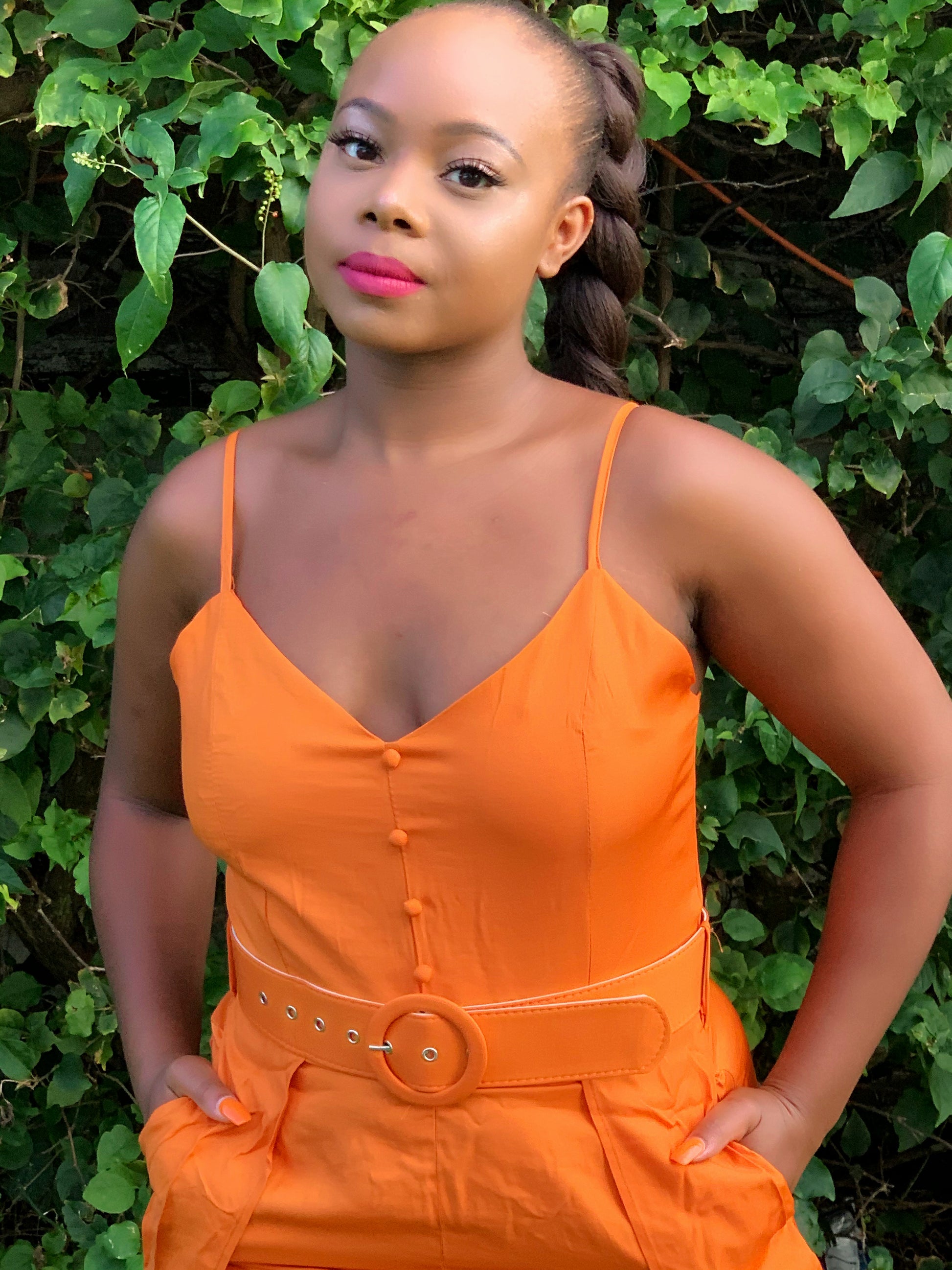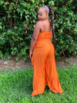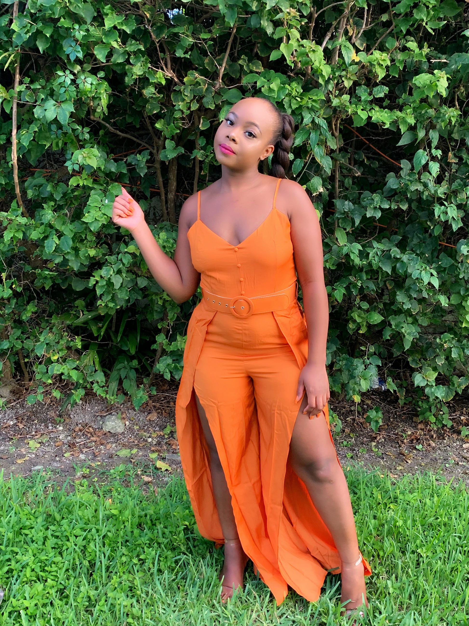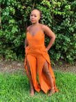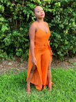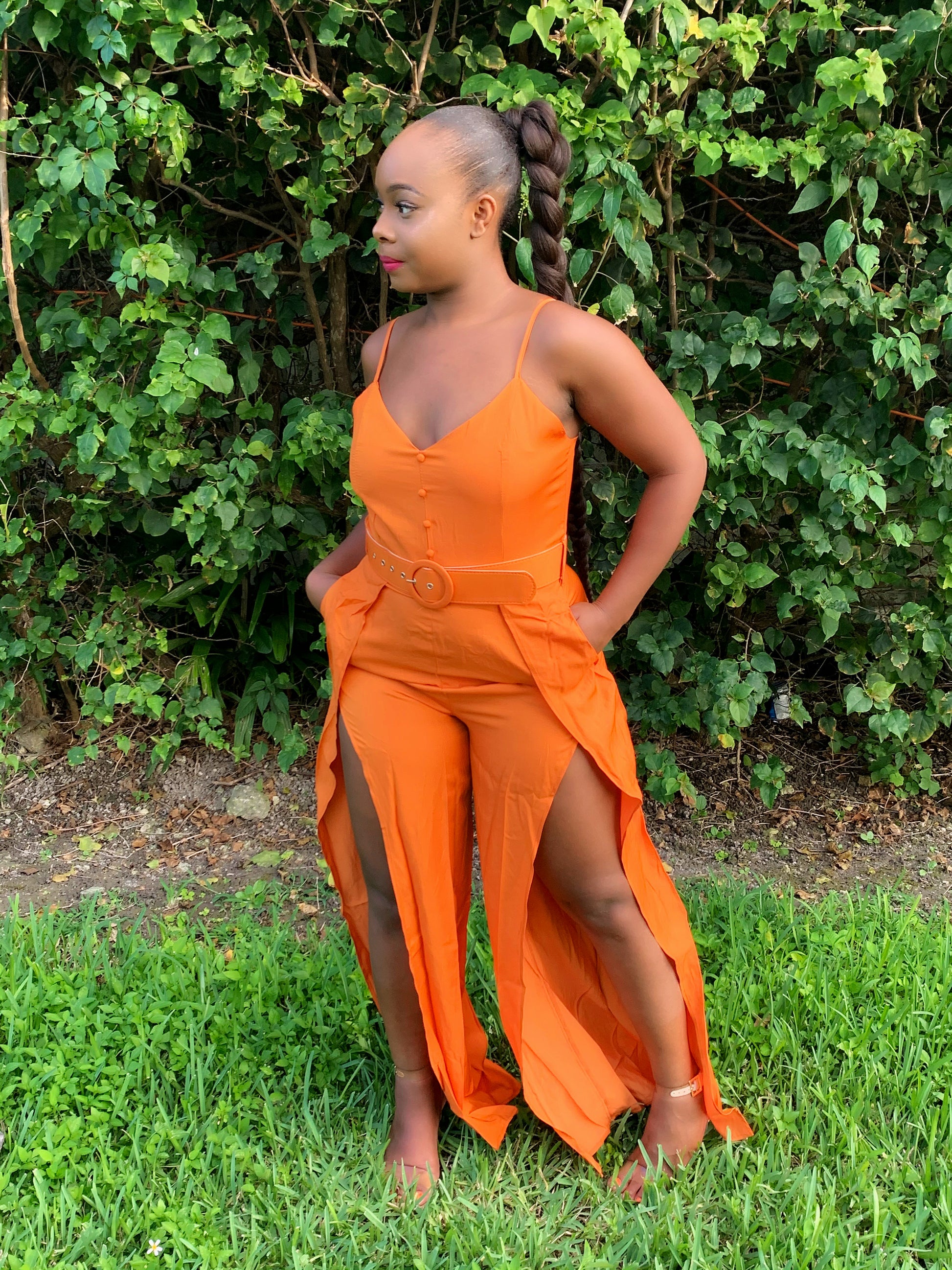 This jumpsuit is a Queen amongst Queens! Featuring a non stretch fabric, round neckline, spaghetti straps, slit legs, belted midriff, and zipper closure.