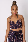 This City Pant Set features a woven striped design featuring a crop top with bonding, a Sweetheart neckline, and partially elasticized hem, as well as a pair of a wide-leg pants with a high-waist tie closure and ruffle design.