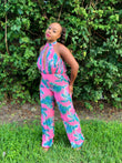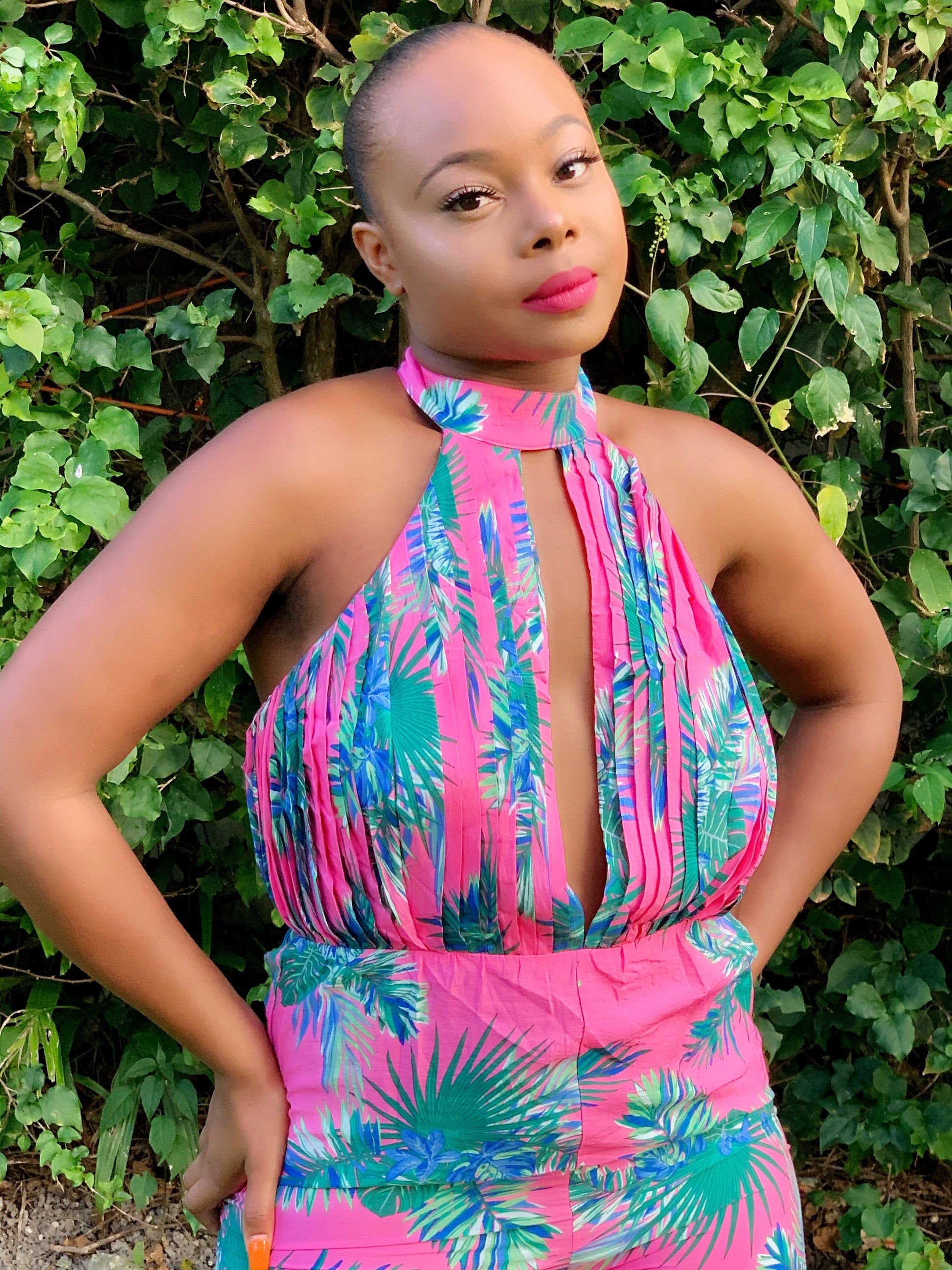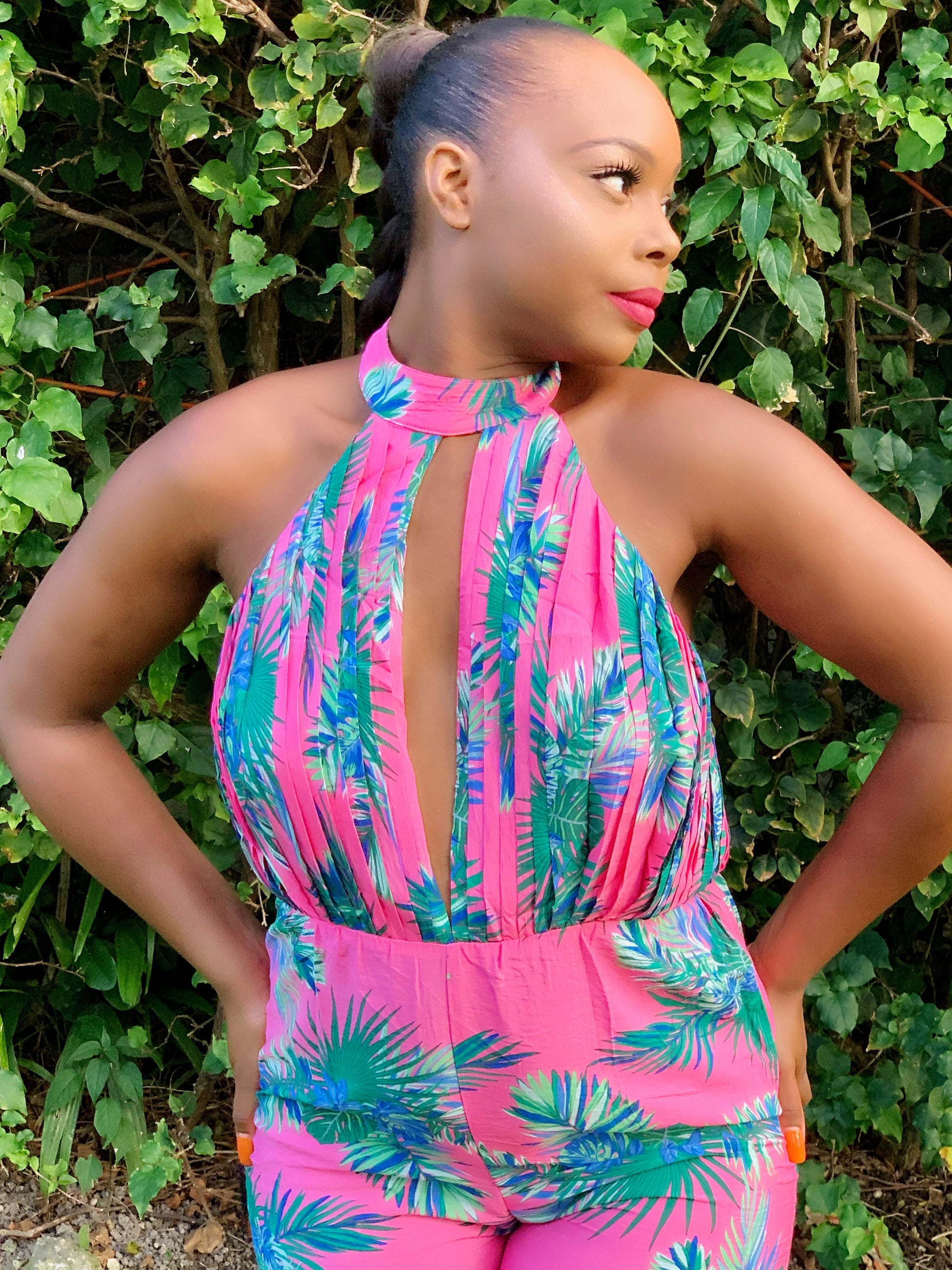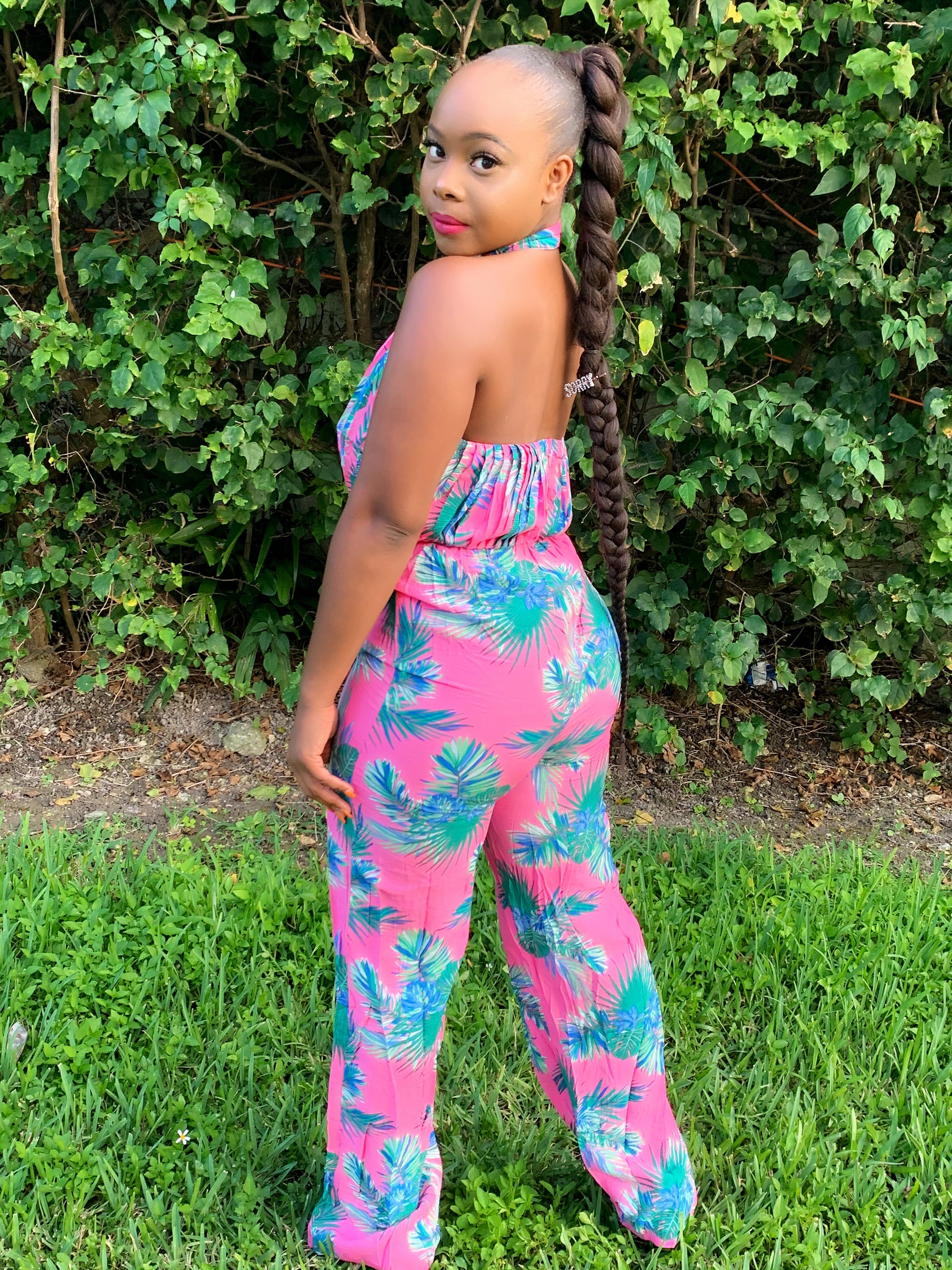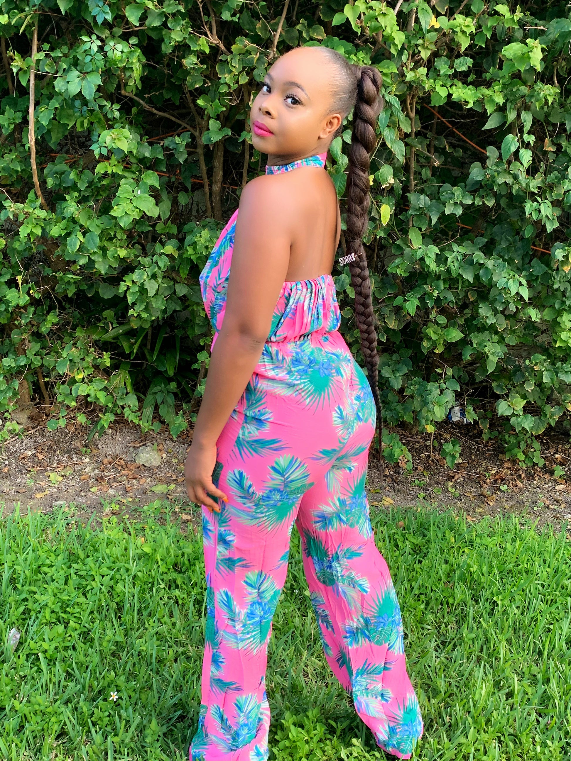 This jumpsuit is pink and sexy and floral all over! Featuring a non stretch fabric, turtle neck neckline, deep open v chest, bold floral pattern with button and zipper closure.